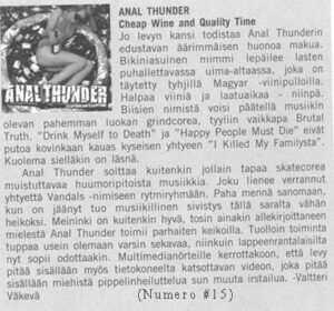 Lappeenrannan kohubändi iskee uudella miniceedeellä. Anal Thunder tunnetaan lähinnä ulkomusiikillisista toilailuista, vaikka bändillä on suomalaisittain varsin mukavasti materiaalia konkreettisessa muodossa. Bändin aiempaa tuotantoa on debyyttiseiska “Greetings From Uranus”, “Will Fuck For Crack” mcd sekä mielenkiintoinen splittikrapula No Redeeming Social Valuen kanssa. Puhetta on myös ollut, että bändi julkaisisi kesään mennessä “Greetings From Uranus” lätyn bonusmausteilla höystettynä. Ei varmaan ihan perseestä? Mutta entä sitten “Cheap Wine and Quality Time”?
